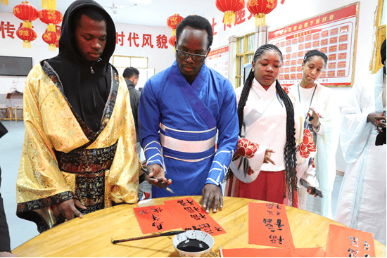 红灯高挂迎新春,墨香氤氲传情谊。2月2日下午,江西新余良山镇下保村文化礼堂热闹非凡,由江西工程学院马克思主义学院联合语言与传播学院(国际教育学院)、党办、图书馆等单位共同举办的“新春添年味,笔墨送祝福”寒假留学生迎新春活动在此温情启幕。来自尼日利亚、津巴布韦、巴基斯坦、刚果(金/布)等国家的10名外国留学生,走进这座全国乡村旅游重点村——下保村,在笔墨挥洒间感受中国年味,于乡土烟火中读懂中国乡村振兴的生动实践。