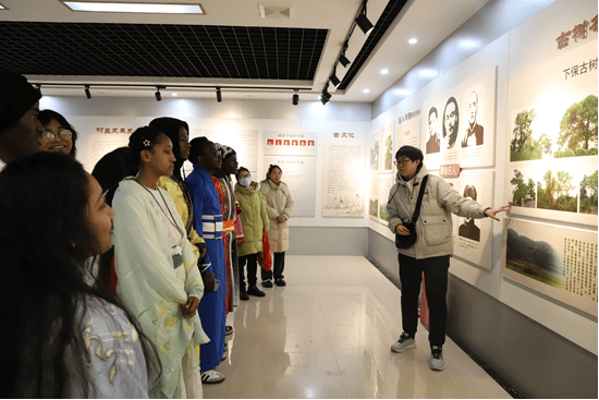写完春联,留学生们走进下保文化展示馆,开启了一场穿越乡土岁月的文化之旅。农耕器具展区里,蓑衣、犁耙、石磨等老物件让留学生们好奇不已,纷纷驻足询问用途;乡村发展展板前,从新余市首批中心示范村到中国美丽休闲乡村,再到第四批全国乡村旅游重点村的蜕变历程,通过图片、文字与实物生动呈现。